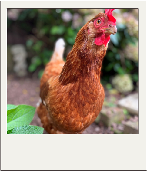 ”Devon has also brought me a rescue chicken named Nugget who seems to think every day is a bring your chicken to work day.“